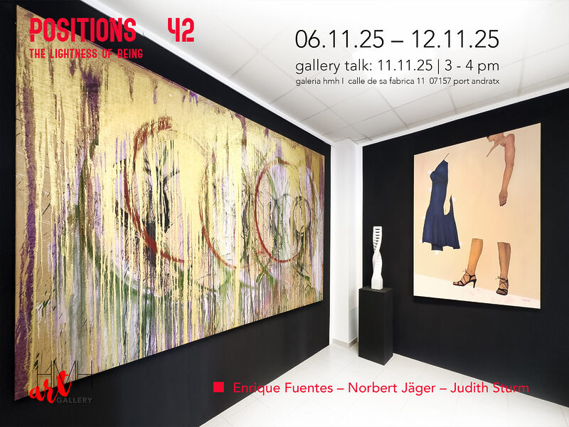 POSITIONS – 42 | The Lightness Of Being Gruppenausstellung | Enrique Fuentes –Norbert Jäger – Judith Sturm Ausstellungsdauer: 06.11.25 – 12.11.25 The Lightness of Being stellt drei künstlerische Positionen gegenüber, die sich mit Ursprung, Form und Identität auseinandersetzen. Enrique Fuentes’ Malerei transformiert mythische Urbilder in zeitgenössische Gestik. Norbert Jägers skulpturale DNA-Struktur übersetzt Bewegung und Leichtigkeit in materielle Form. Judith Sturm hinterfragt in ihren Paper Dolls das Fragment als Sinnbild einer fragilen, konstruierten Identität. Special: Gallery Talk: Dienstag, 11. November 2025 […]