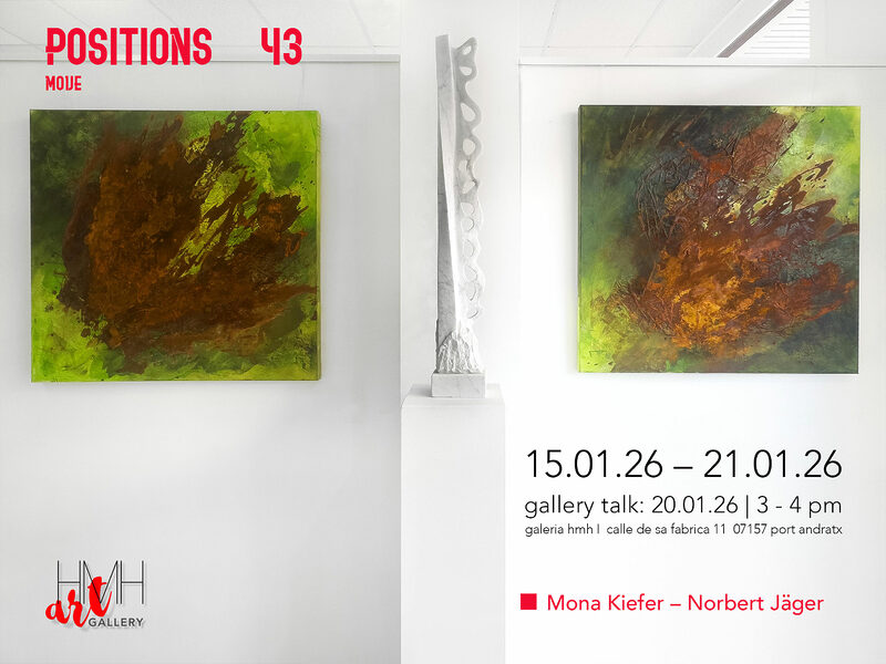 POSITIONS – 43 | Move Group exhibition | Mona Kiefer – Norbert Jäger Duration of the exhibition: 15.01.26 – 21.01.26 Positions 43 – Move versammelt Positionen, die sich auf unterschiedliche Weise mit Bewegung und der Wahrnehmung von Raum auseinandersetzen. Mona Kiefer arbeitet in der Tradition der abstrakten Malerei, ihre haptischen, energiereichen Werke hier in Grüntönen und Rost lassen die Materialität der Farbe als Träger innerer Bewegung wirken. Norbert Jägers Marmorskulptur Elftree greift klassische Bildhauerei auf, transformiert sie jedoch in eine […]