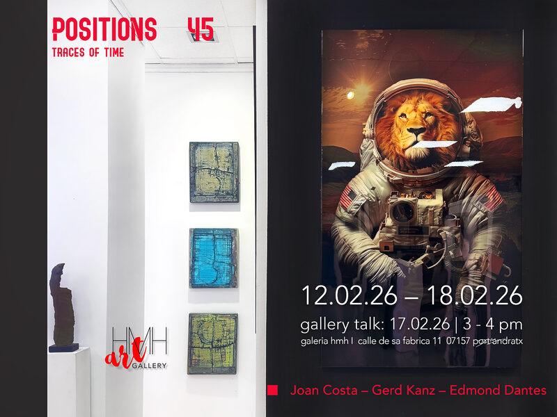 POSITIONS – 45 | Traces Of Time Group exhibition | Joan Costa – Gerd Kanz – Edmond Dantes Exhibition Duration: 12.02.26 – 18.02.26 In Traces of Time, past, present, and future meet in surprising ways. Edmond Dantes’ hyperrealistic lion in an American astronaut suit explores Mars – a symbol of discovery, courage, and new horizons. Gerd Kanz’ woodcuts resemble excavated tablets from long-lost civilizations, archaeological traces that tell their stories. Joan Costa’s rustic steel sculpture “Posidonia” evokes submerged plant worlds […]