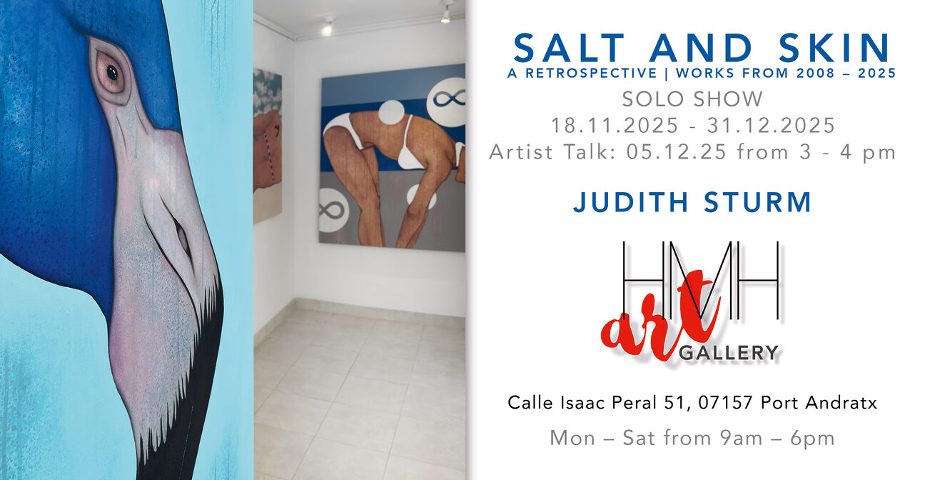 LAGUNAS – JUDITH STURM Solo exhibition Exhibition dates: 02.10.2025 – 31.10.2025 | Gallery talk: 07.10.2025 from 3pm – 4pm With the series Lagunas, Judith Sturm presents a limited special edition of 20 small-format framed works, each named after one of Mallorca’s well-known lagoons. The works – measuring between 33 and 43 centimeters in diameter – are created in oil on wood using Sturm’s characteristic salt technique. For this, she works with salt from the Salinas de Es Trenc, which gives […]