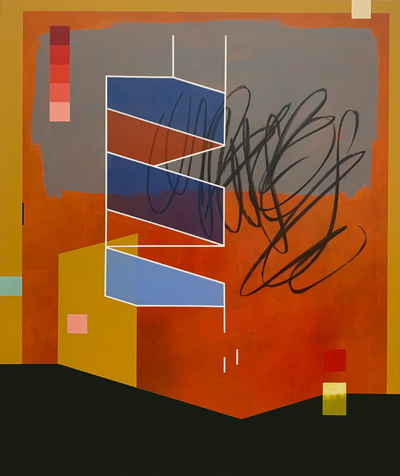 Seine Bildsprache schöpft aus dem Erbe des Konstruktivismus, des Abstrakten Expressionismus und Elementen des Brutalismus, doch sein Ansatz ist unverkennbar zeitgenössisch. Auf den ersten Blick mag sein Werk architektonisch oder schematisch wirken, doch bei genauerer Betrachtung offenbaren sich Schichten roher, greifbarer Energie. Bewegung, Brüche und eine subtile emotionale Unterströmung durchdringen die Formen und stellen die Stille der Form in Frage. Seine Kompositionen evozieren oft imaginäre Stadtlandschaften, dekonstruierte Strukturen oder innere psychologische Welten – Räume, die zugleich vertraut und desorientiert wirken.